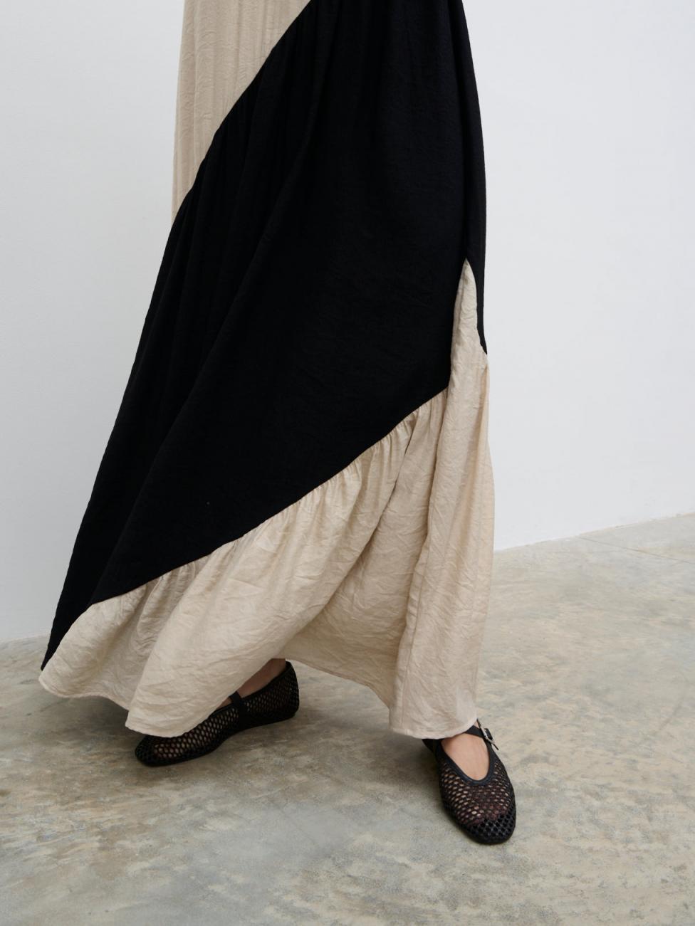 Product Details Slim adjustable straps Fully lined Low v-neckline on front and back Loose trapeze silhouette Full skirt Maxi length Composition Main 75% Viscose 25% Nylon Lining 91% Polyester 9% Elastane