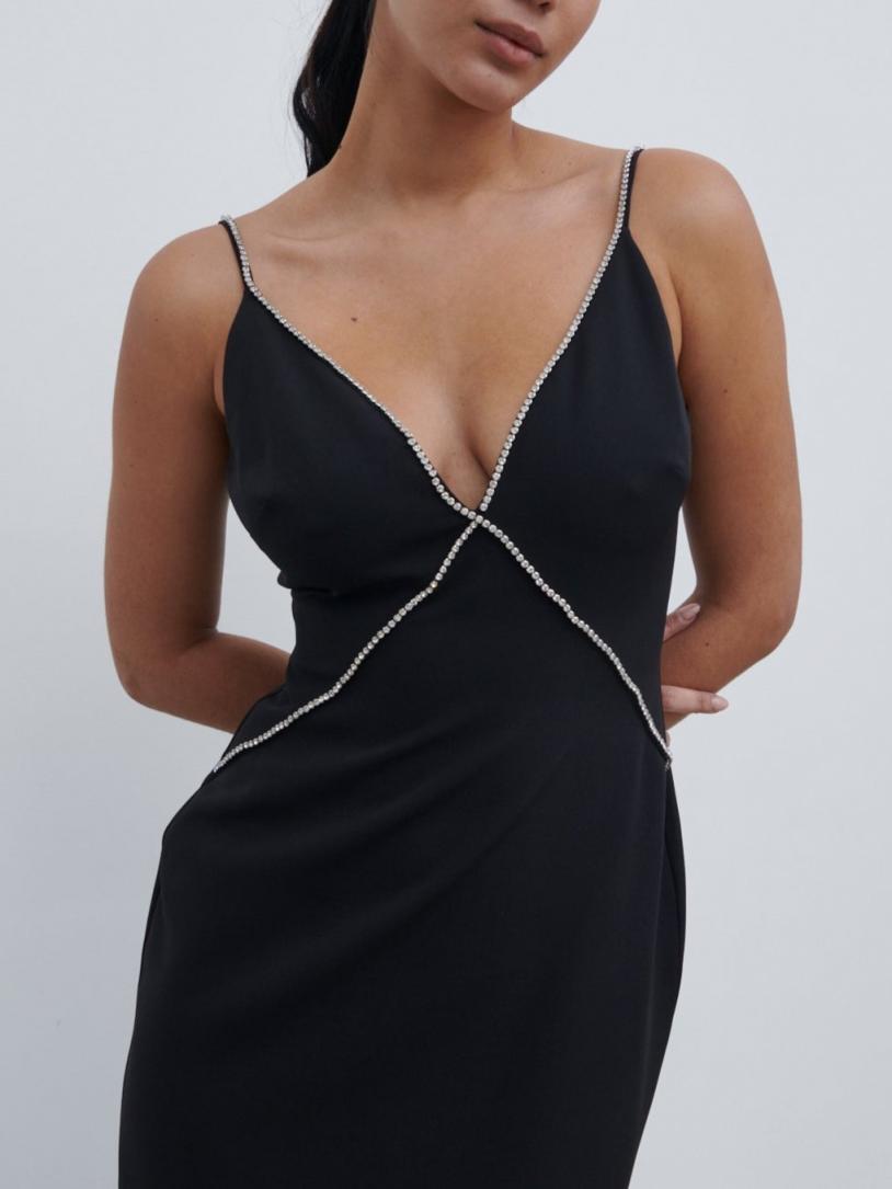 Product Details Stretch crepe fabric Embellished trim Plunge neckline Body skimming silhouette Concealed zip and hook detail Maxi length Composition Main 90% Polyester 10% Elastane Lining 91% Polyester 9% Elastane